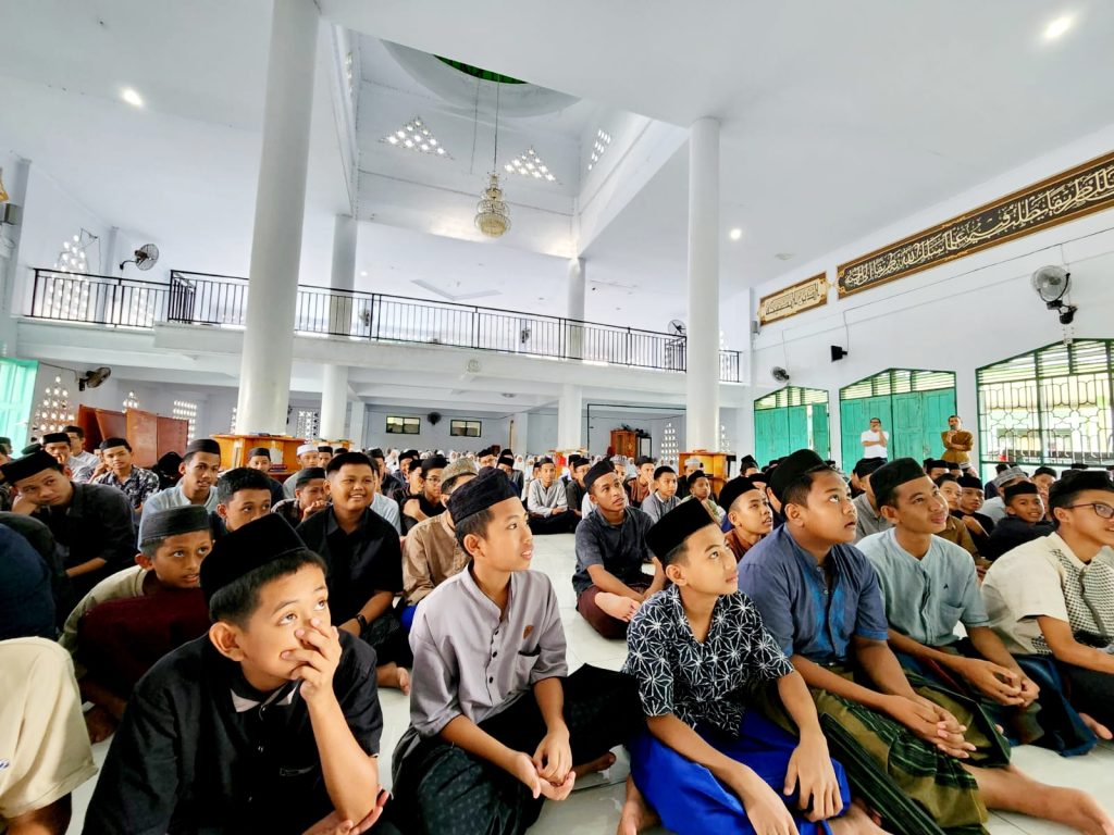 Santri Ponpes Al-Junaidiyah Biru antusias saat mendengar ceramah motivasi yang disampaikan Dr. Andhyka Sedyawan di Masjid Ponpes Al-Junaidiyah Biru, Selasa, 11 Juni 2024.