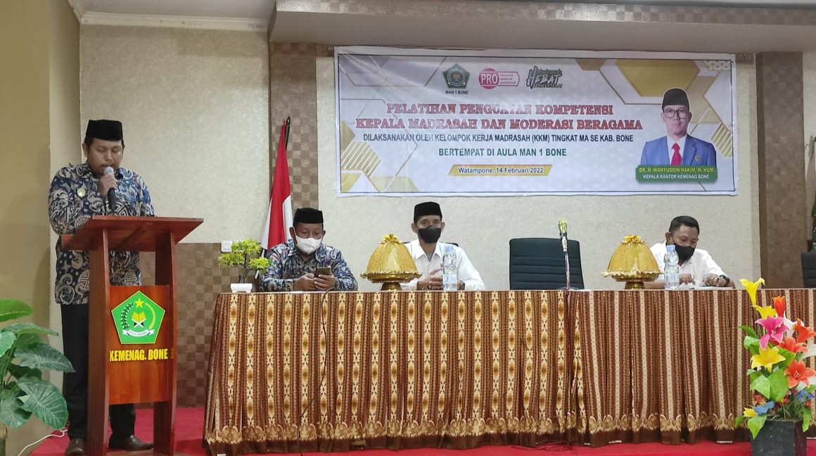 Kelompok Kerja Madrasah (KKM) tingkat Madrasah Aliyah se Kab. Bone, gelar Pelatihan Penguatan Kompetensi Kepala Madrasah dan Moderasi Beragama, di aula MAN 1 Bone, Senin, 14 Februari 2022.