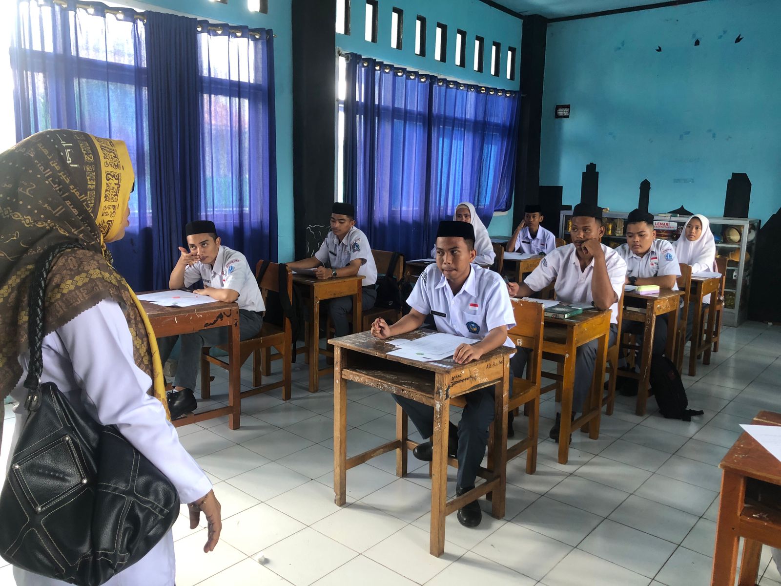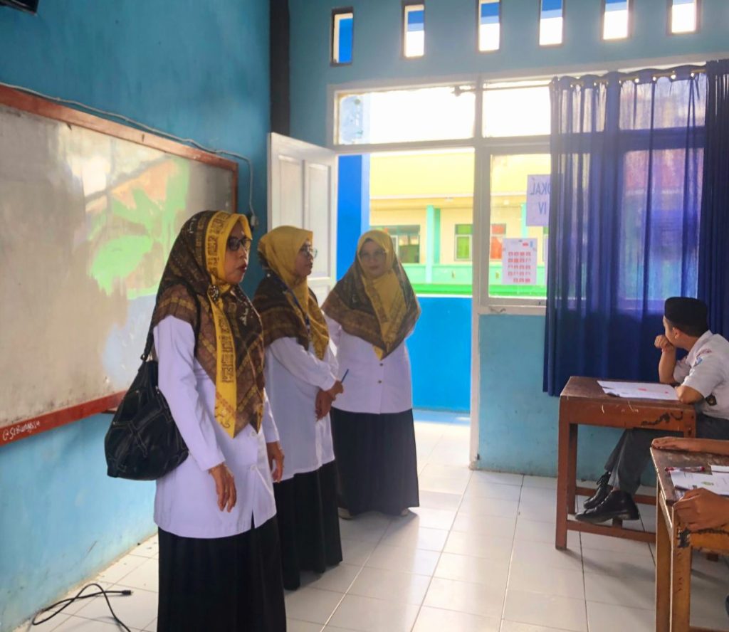 Didampingi Kepala MA Al-Junaidiyah Biru, Mastati Suhardy, M.Pd.I, pengawas melihat langsung jalannya AM yang digelar bagi siswa kelas XII. AM merupakan ujian yang wajib diikuti siswa kelas akhir pada madrasah sebagai syarat kelulusan untuk kemudian diberikan pengakuan dari negara berupa ijazah belajar.