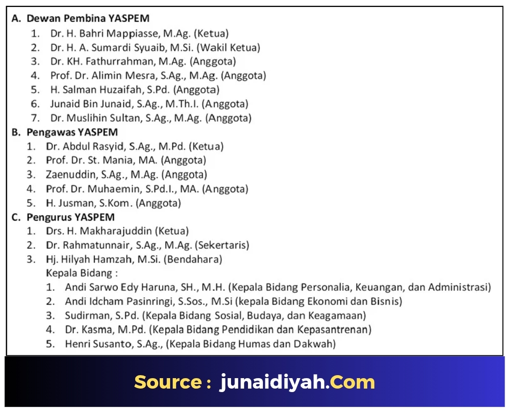 Hingga berita ini dikabarkan Pasca dilantik oleh Ketua Dewan Pembina Yaspem didampingi Dewan Pengawas Yaspem, Ketua Pengurus Yaspem, Drs. H. Makharajuddin gelar Rapat Kerja (Raker) bersama Pengurus, Pimpinan Pondok dan Kepala Lembaga Ponpes Al-Junaidiyah Biru di tempat yang sama. Kita berdoa dan akan selalu mendukung, Al-Junaidiyah Biru akan semakin jaya dibawah nahkoda kepengurusan yang baru. Amin
