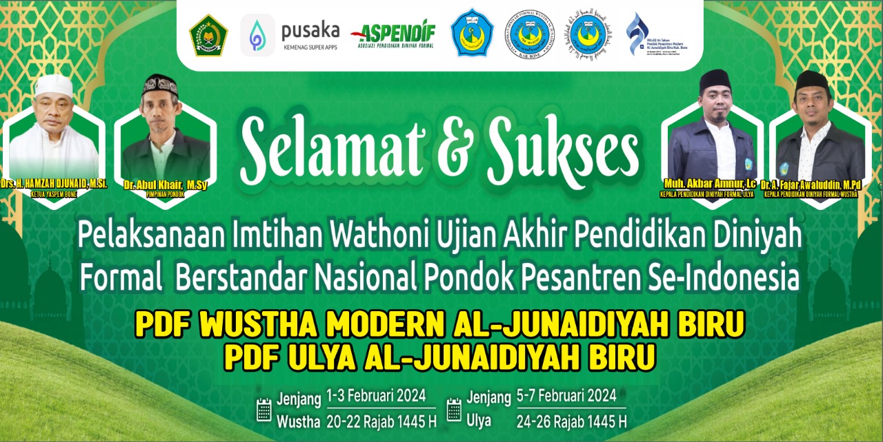 Pelaksanaan Ujian Akhir Pendidikan Diniyah Formal Berstandar Nasional/Imtihan Wathani (UAPDFBN/IW) secara perdana diikuti oleh para santri jenjang akhir Pendidikan Diniyah Formal Wustha Modern Al-Junaidiyah Biru tahun ajaran 1444/1445 H – 2023/2024 M di Pondok Pesantren Al-Junaidiyah Biru Kabupaten Bone Jalan Jenderal Sudirman No. 5-7 Kelurahan Biru Bone.